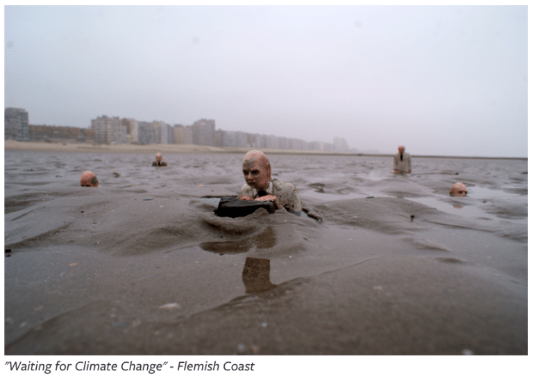 “Waiting for climate change” is Cordal’s 2012 masterpiece. Described as a “Lilliputian army which attests to the end of an era” by David Moinard, Cordal’s miniature clay figurines – no larger than 25 cm – stand passively on Flemish beaches, some up to their necks in sand, as if waiting for the inevitable rising seas to swallow them whole.